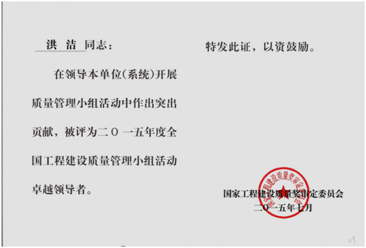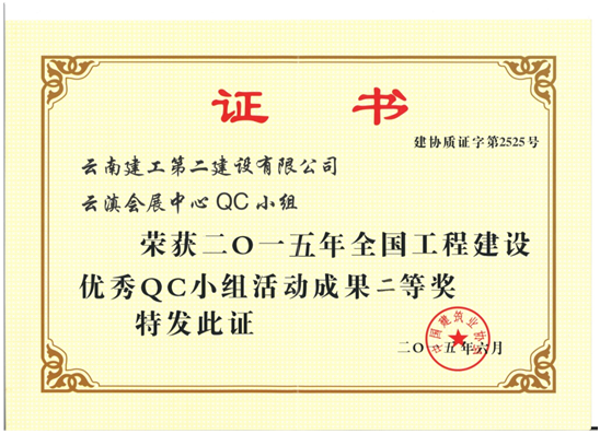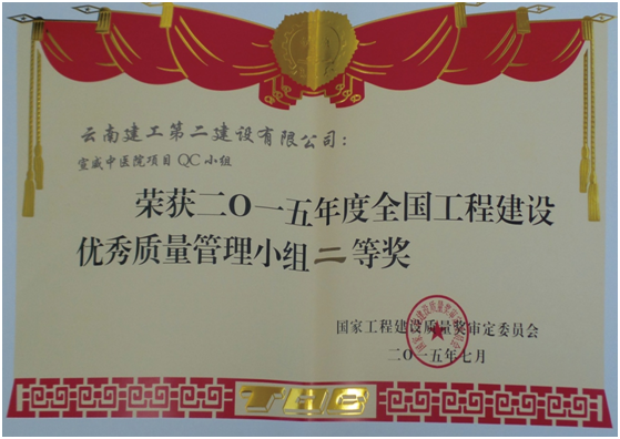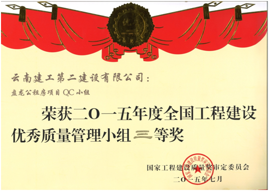 經(jīng)云南省建筑業(yè)協(xié)會(huì)推薦,公司申報(bào)中建協(xié)優(yōu)秀QC小組成果一項(xiàng),中施協(xié)優(yōu)秀質(zhì)量管理小組兩項(xiàng),經(jīng)評(píng)審發(fā)布云滇會(huì)展中心QC小組榮獲全國(guó)工程建設(shè)優(yōu)秀QC小組活動(dòng)成果二等獎(jiǎng),宣威中醫(yī)院項(xiàng)目QC小組榮獲全國(guó)工程建設(shè)優(yōu)秀質(zhì)量管理小組二等獎(jiǎng),盤龍公租房項(xiàng)目QC小組榮獲全國(guó)工程建設(shè)優(yōu)秀質(zhì)量管理小組三等獎(jiǎng)。同時(shí)公司榮獲全國(guó)工程建設(shè)質(zhì)量管理小組活動(dòng)優(yōu)秀企業(yè)稱號(hào),公司總工程師洪潔被評(píng)為全國(guó)工程建設(shè)質(zhì)量管理小組活動(dòng)卓越領(lǐng)導(dǎo)者。